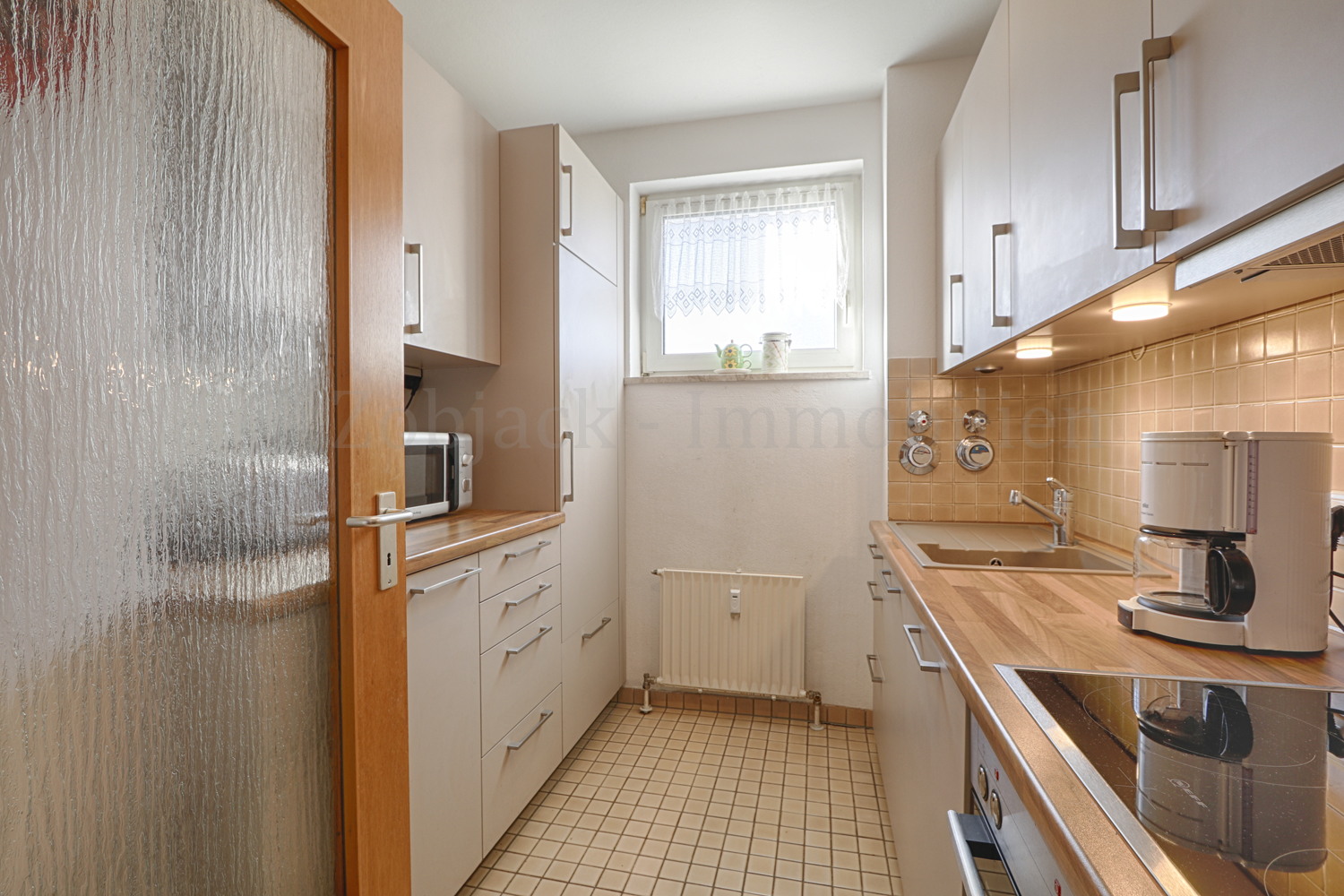 Die separate Küche ist mit einer praktischen Einbauküche ausgestattet und bietet ausreichend Platz zum Kochen. Das helle Bad ist zeitlos gefliest und verfügt über eine Badewanne und ein Fenster, was für eine angenehme Atmosphäre und gute Belüftung sorgt.
